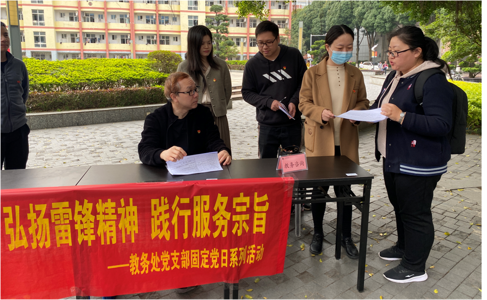 为弘扬雷锋精神,践行服务宗旨,进一步宣传与师生密切相关的教务、学业管理等业务,发挥支部党员先锋模范作用,3月14日,教务处党支部在校本部食堂前开展教学服务现场咨询活动。