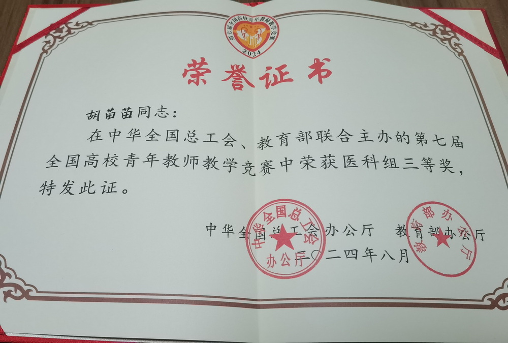 2024年8月26日—30日,由中华全国总工会、教育部联合主办的第七届全国高校青年教师教学竞赛决赛在上海交通大学举办。BET体育365登录入口体育与健康学院胡苗苗老师以第十届广西高校青年教师教学竞赛医科组一等奖第一名的优异成绩代表广西参加决赛,经过激烈角逐,最终获得国赛医科组三等奖。